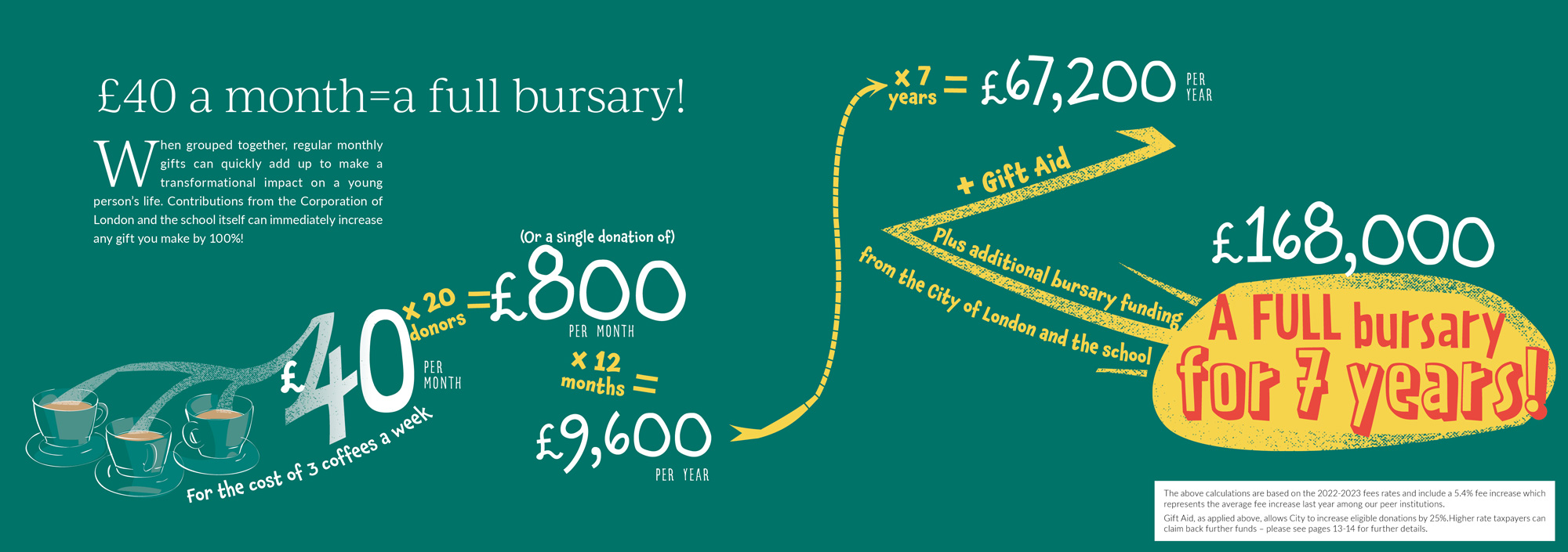 The graphic tells the visual story of donating the cost of three coffees per week, with other donors making the same commitment, adding up to a full bursary.