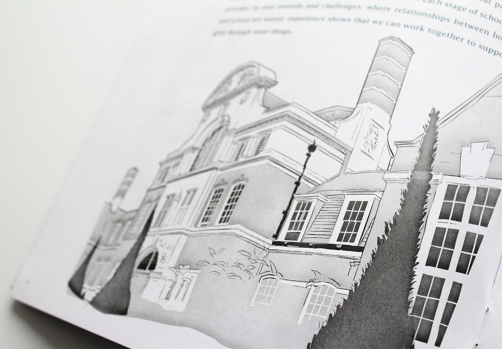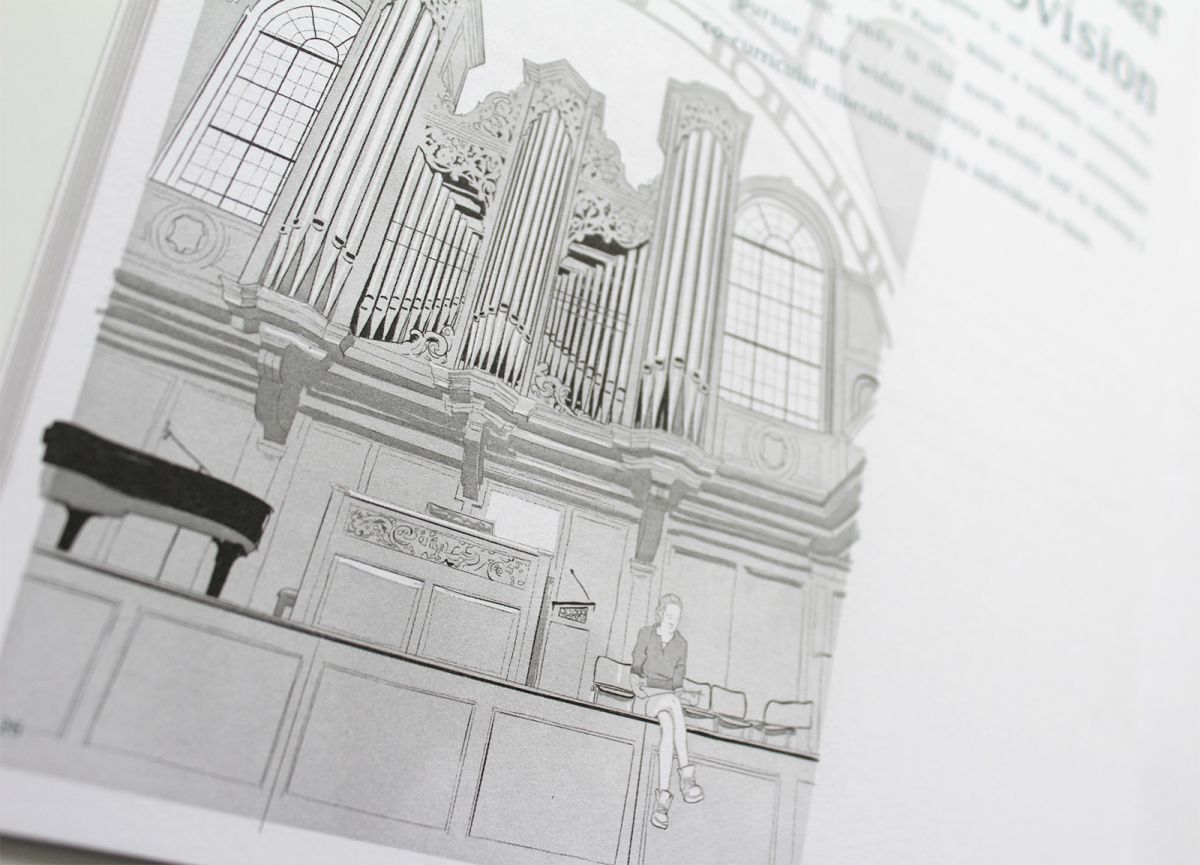 The handbook needed some imagery to break the columns of text so rather than include photographs which would have given the publication more of a prospectus feel, we illustrated architectural features. The parents were already very familiar with the school so illustrations offered a softer perspective.