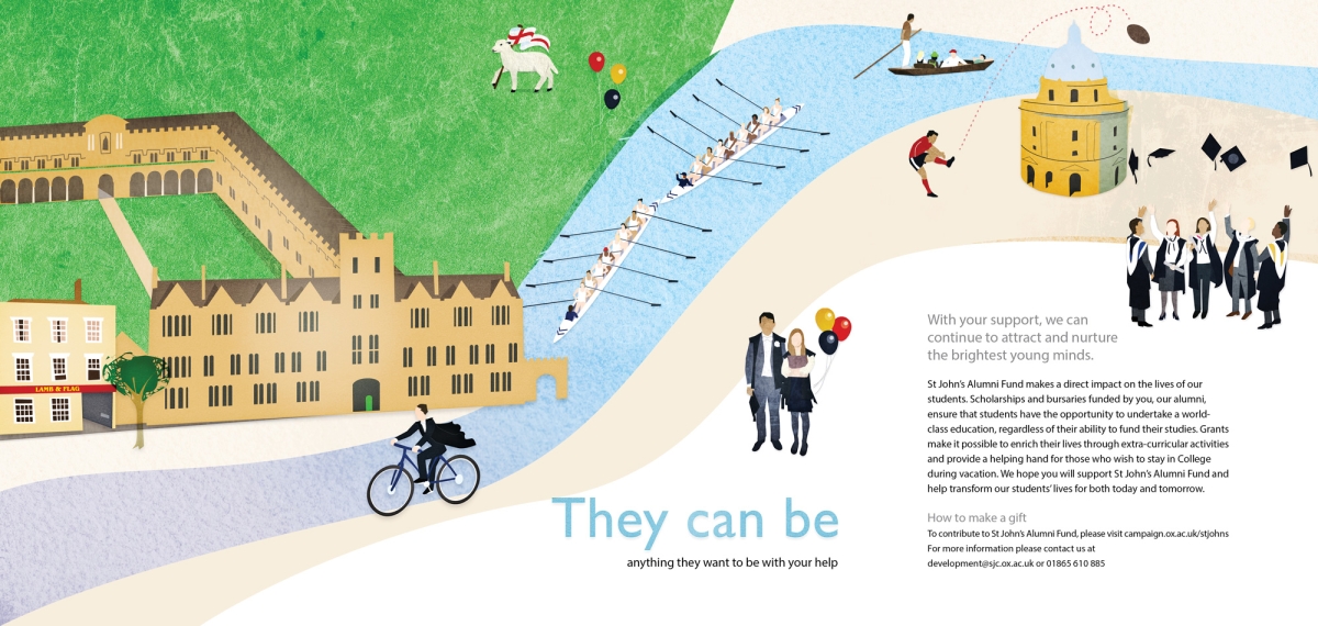 The first spread then reminded alumni what opportunities they enjoyed at St John's, including visual prompts such as St John's architecture and icons, and wider Oxford experiences. The last full spread showed the full picture and the call to action; to support the work of St John's in providing all their students a world-class education.
