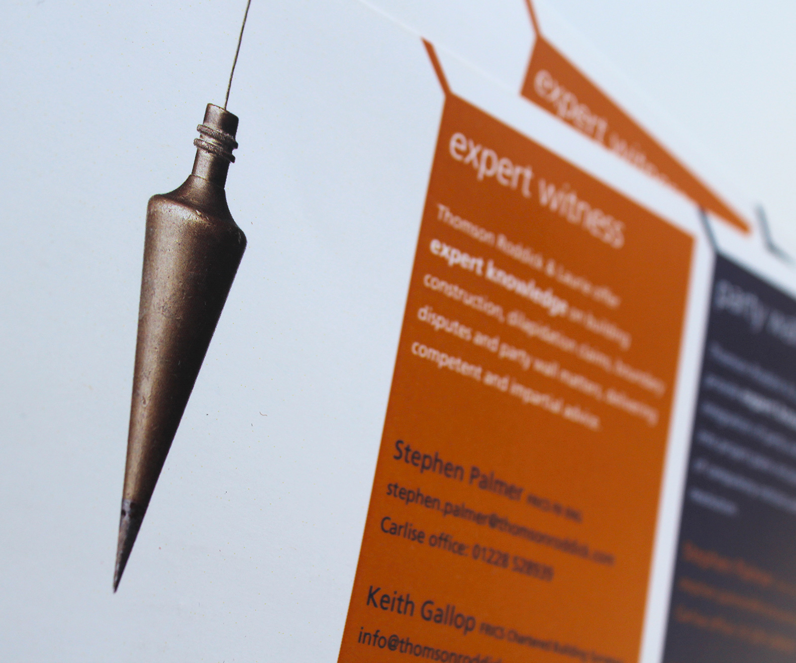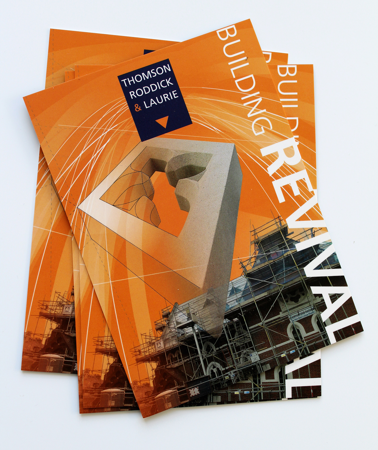 The antique plumb line expresses a strong heritage of precision and craftsmanship. Used with the bright brand colours and white space, this design speaks to the contemporary positioning of the company's offering. Using images of older architecture with contemporary graphics helps give the historic expertise of Thomson, Roddick and Laurie a sense of relevance for now and for preserving the past for generations to come.