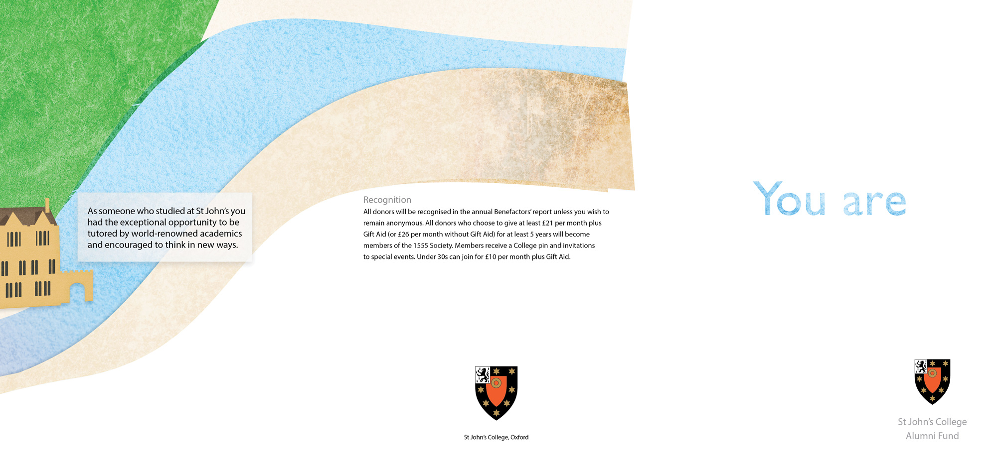 We worked with St John's College to develop a concept including illustration, for their Annual Fund brochure. The brief was to show alumni all that their St John's education and experience offered them and thus encourage them to give and support the next generation of St John's students. The cover enticed the audience to open and read on as the text 'You are' cleanly demanded that the reader find out what or who they are.