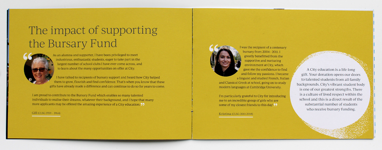 This brochure was designed to work as a companion piece to two other annual communications we design for this client. City of London School for Girls has an informal, energetic voice with a pioneering spirit which breaks out of the somewhat serious tone of the City itself, where is school is located. The brochure design connects with this lively school community through strong colour and graphics as well as bold infographics.