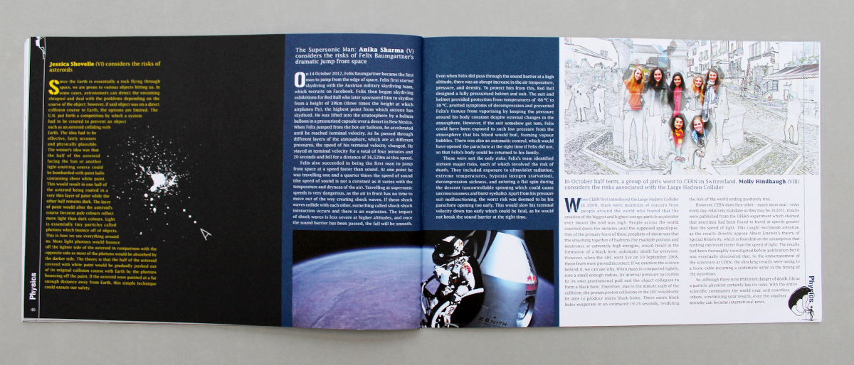 This issue of Paulina is the third we have designed for St Paul's Girls' School, their annual magazine. The theme was 'Risk' so we developed a graphic for the margin to work as a flip-book; a character climbing up the left hand pages and then parachuting down the right hand pages - risky. Other fun elements to design for the text included a letter from a gladiator, asteroids and a trip to CERN, a graphic for the probability Monty Hall problem, and for the English department, an illustration for the cadavres exquis game, used by the students to help them to write 'risky' poetry.