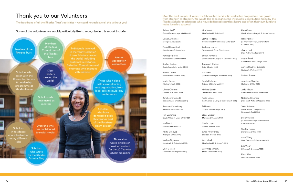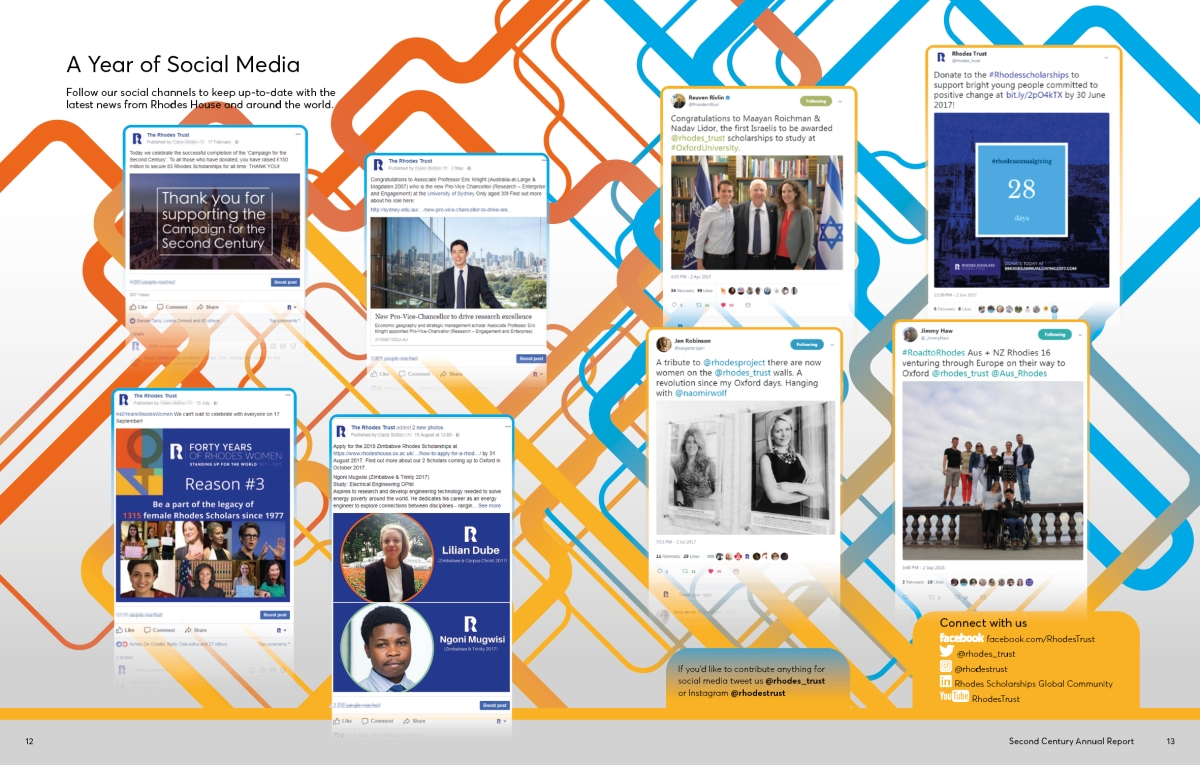 The Annual Report for 2017 includes a throw-out double spread of our illustration of a contrived Oxford panorama of iconic architecture and student-life highlights. On the reverse fold-out pages are our illustrations of current Rhodes Scholars with their words describing their Oxford and Rhodes experience.