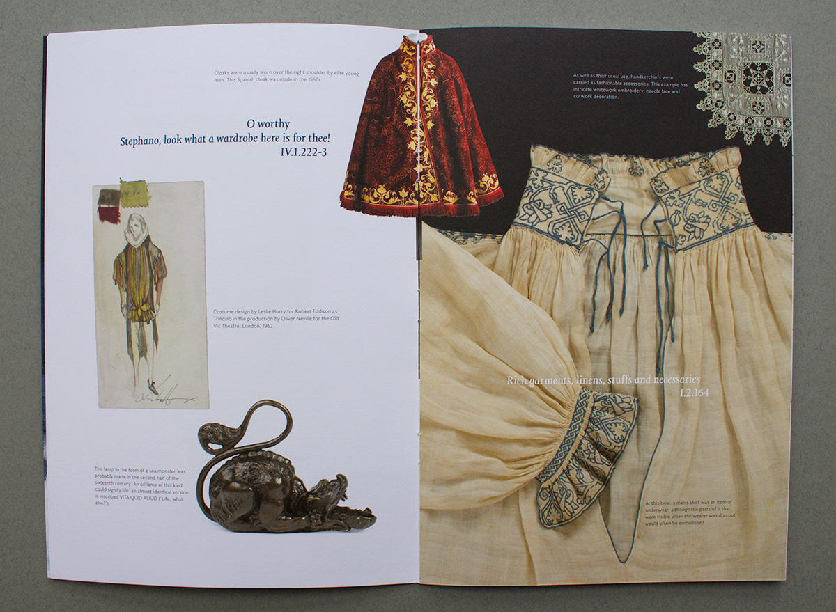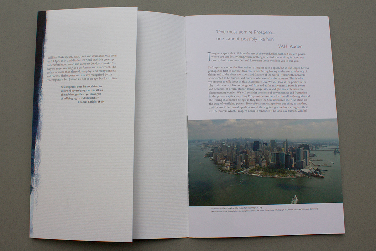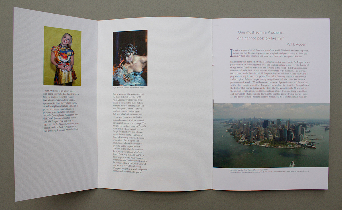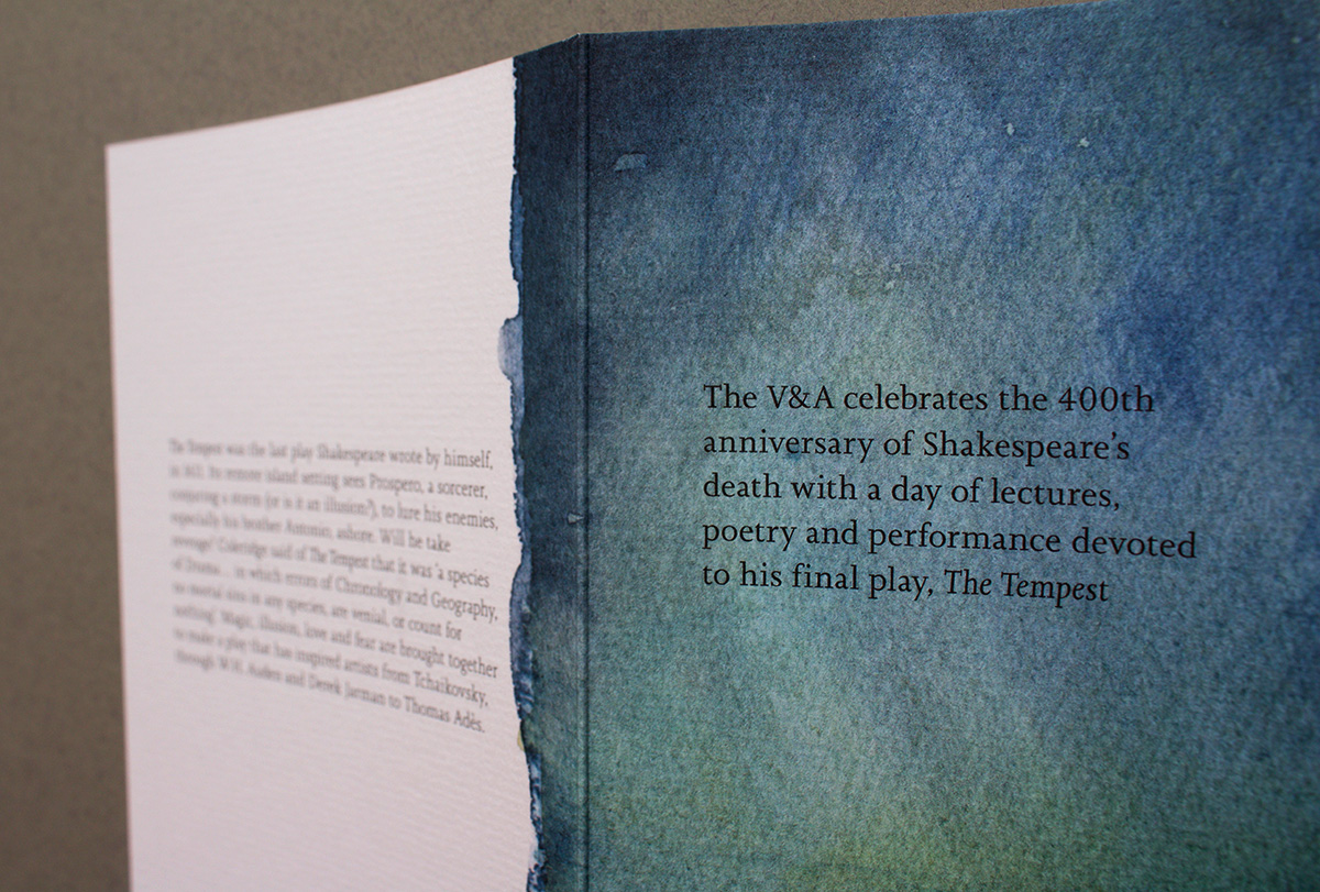 The content of the programme was designed around images of artefacts from the V&A collection that serve to illuminate aspects of the characters and plot from The Tempest. The centre spread includes an image of a handwritten, yet to be completed, poem by Alice Oswald, inspired by the play.