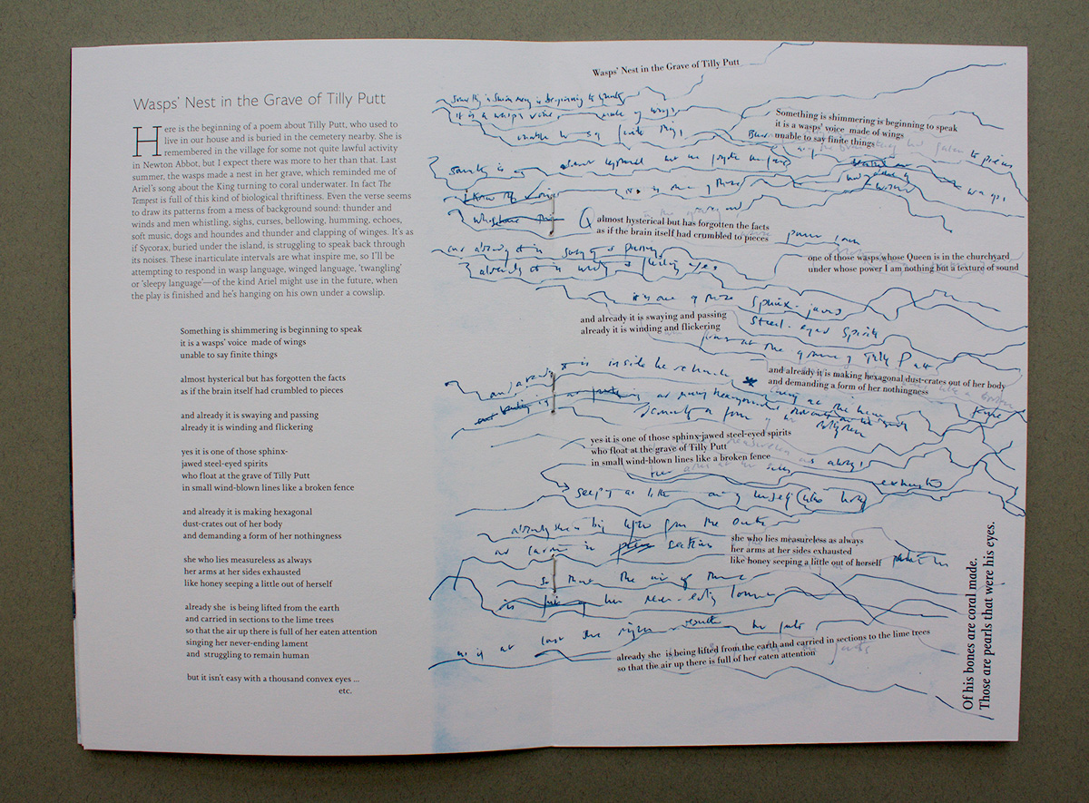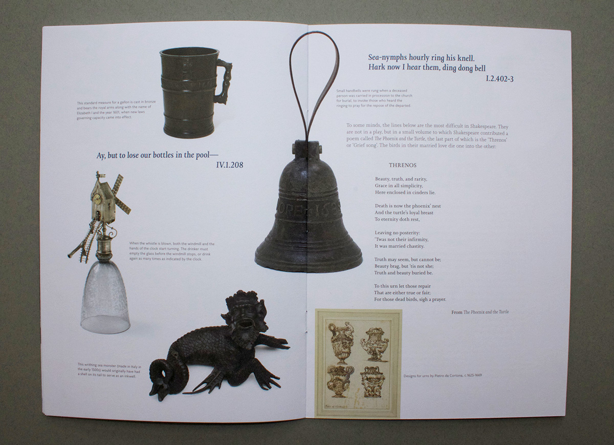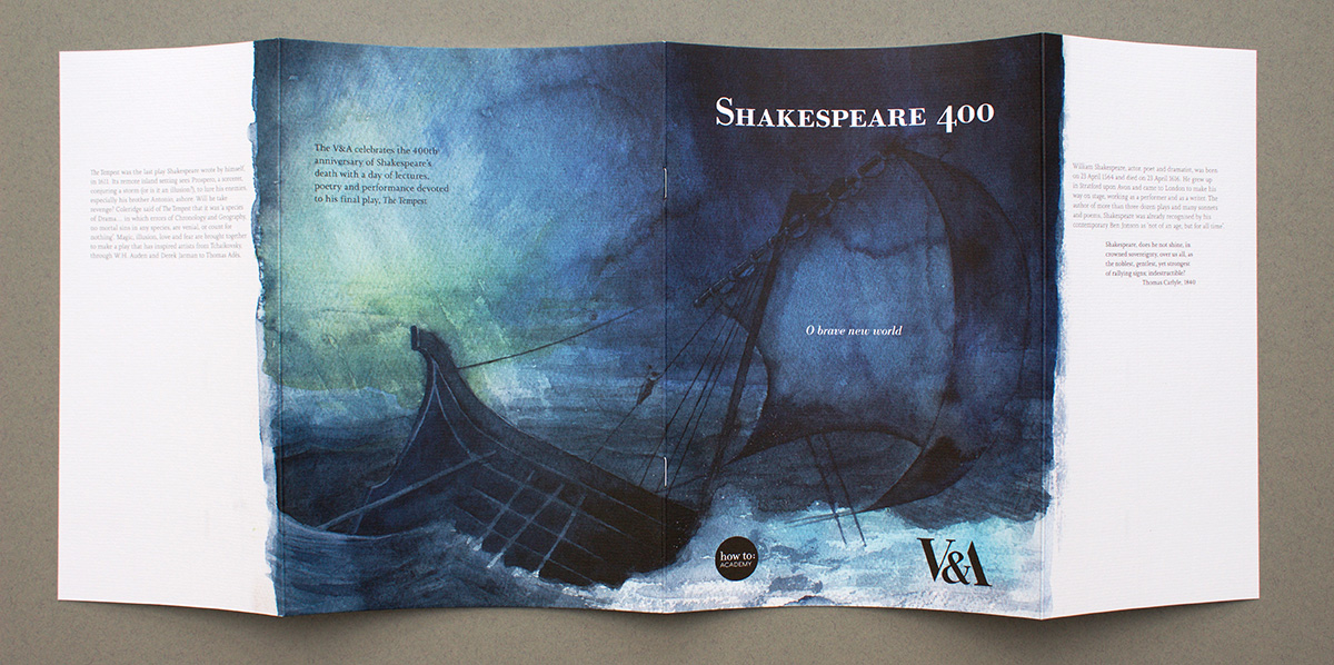 The content of the programme was designed around images of artefacts from the V&A collection that serve to illuminate aspects of the characters and plot from The Tempest. The centre spread includes an image of a handwritten, yet to be completed, poem by Alice Oswald, inspired by the play.