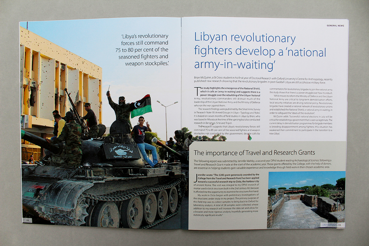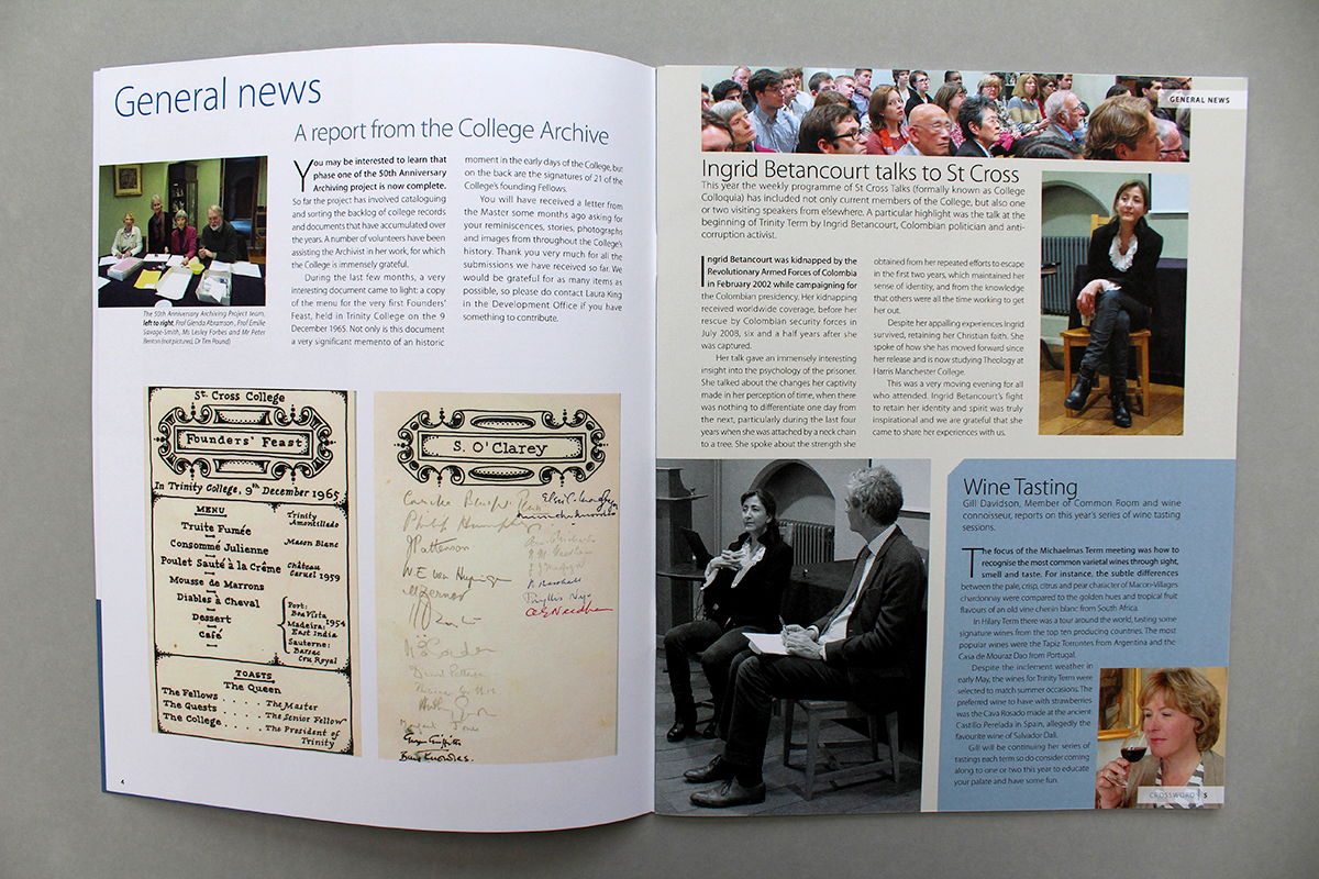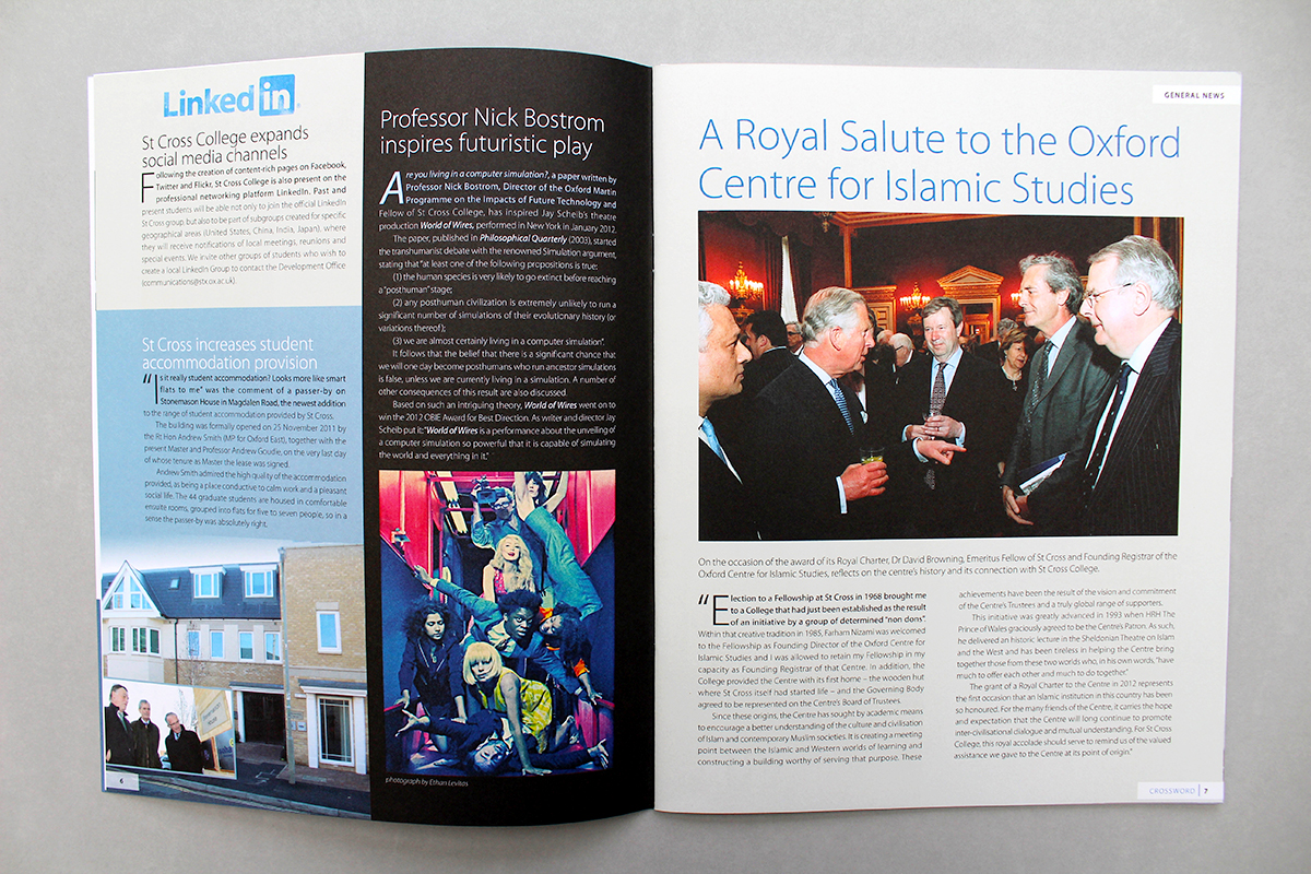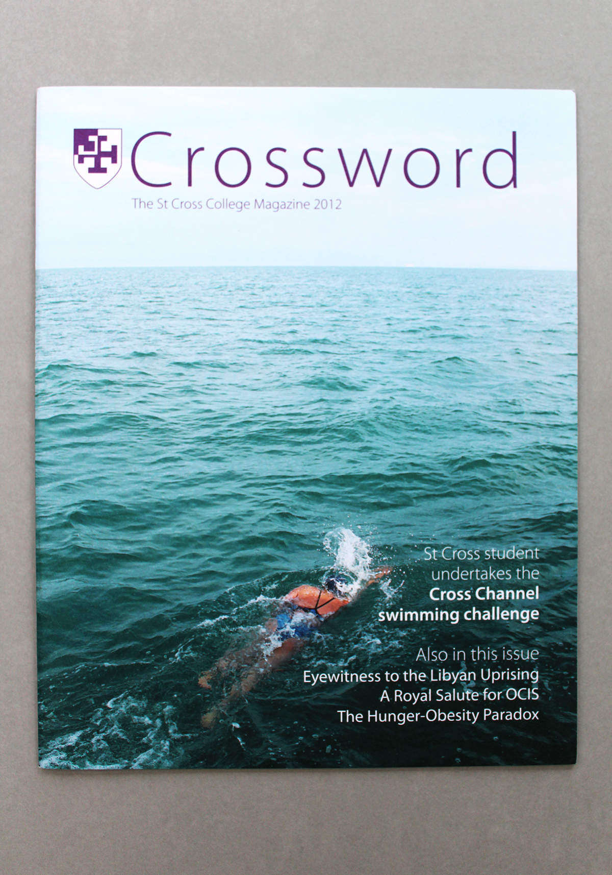 This is the first issue of Crossword that we redesigned for St Cross College, Oxford. It was important to use the St Cross purple as a point of identity and continuity for the College. We then developed a palette of blues and taupes to offset yet complement the striking purple, and to establish a professional and academic visual tone to the publication.